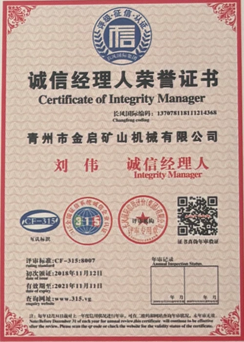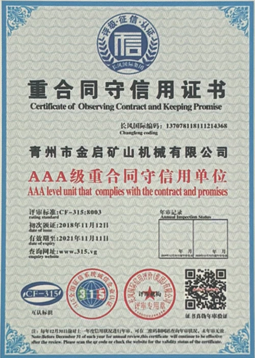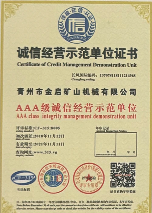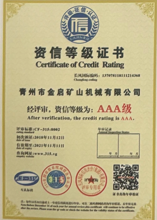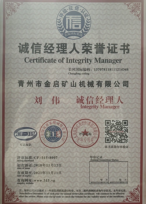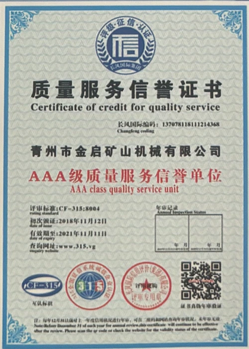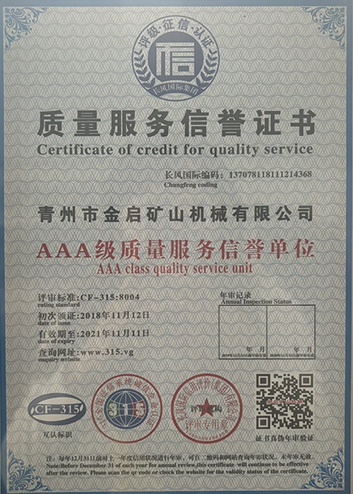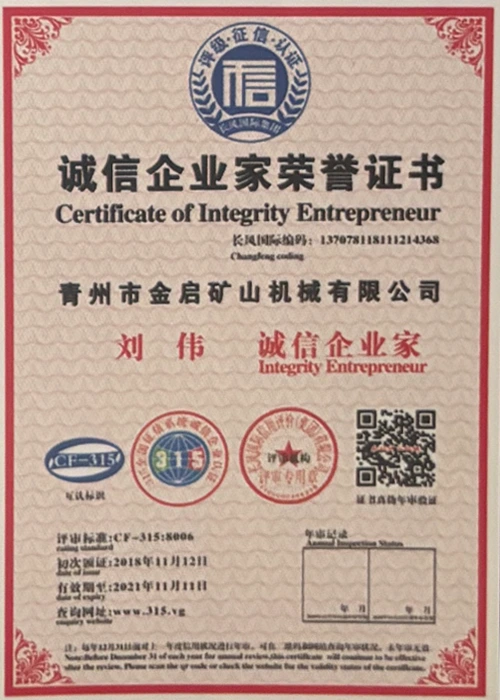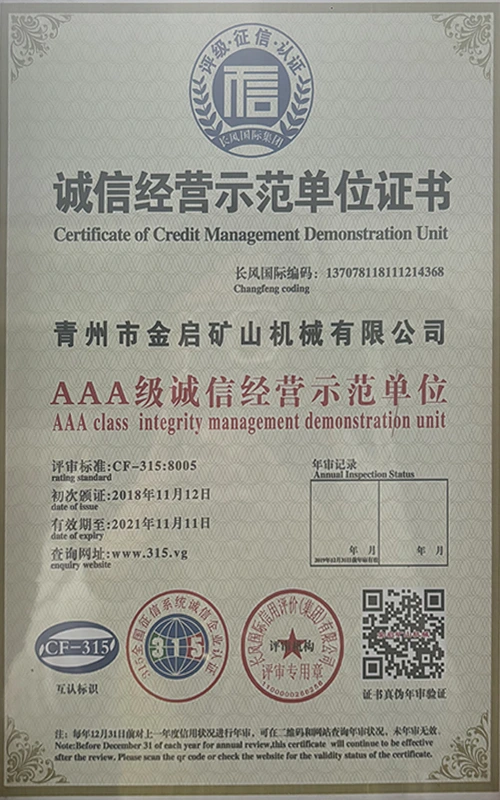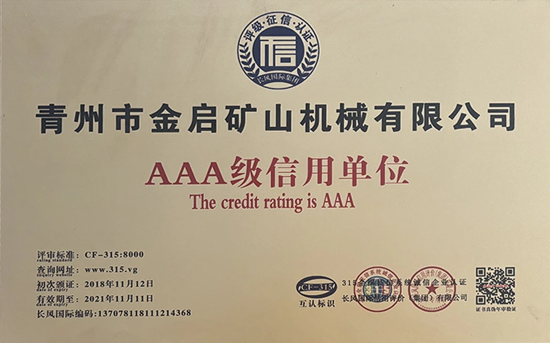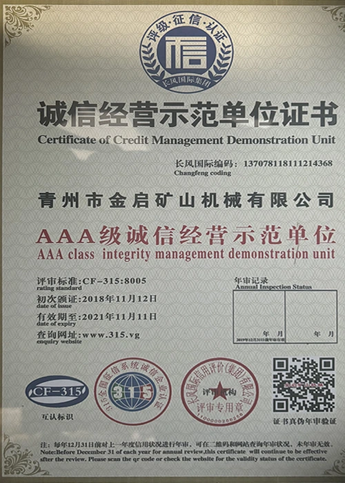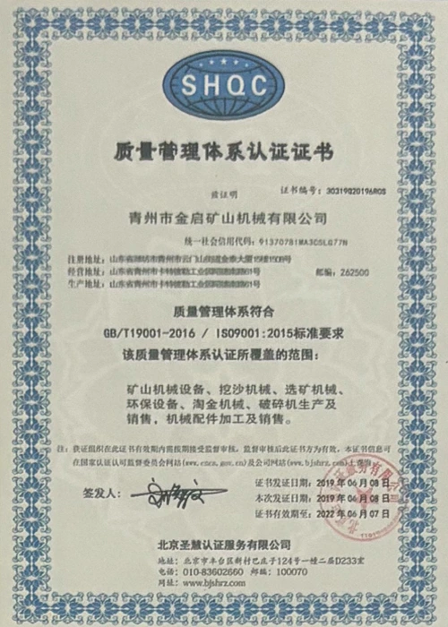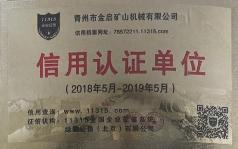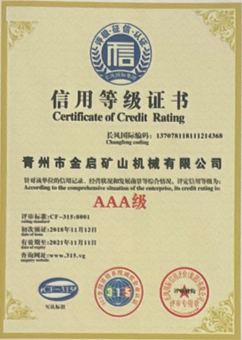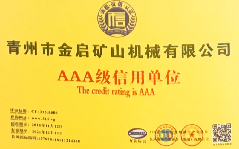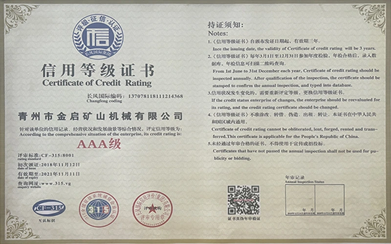 Mei jierrenlange yngeande ûnderfining yn 'e yndustry, fertroud op strange kwaliteitskontrôle en trochgeande technologyske ynnovaasje, hat it bedriuw in oantal gesachhawwende kwalifikaasjes, sertifikaten en oktroai-sertifikaten krigen, ynklusyf sertifikaasje fan ISO-kwaliteitsbehearsysteem, sertifisearring fan mynbouproduktfeiligens, lykas ek meardere útfiningspatinten en patinten foar gebrûksmodel foar optimalisaasje fan apparatuerstruktuer en enerzjybesparjende technology upgrading en enerzjybesparjende technology upgrading.