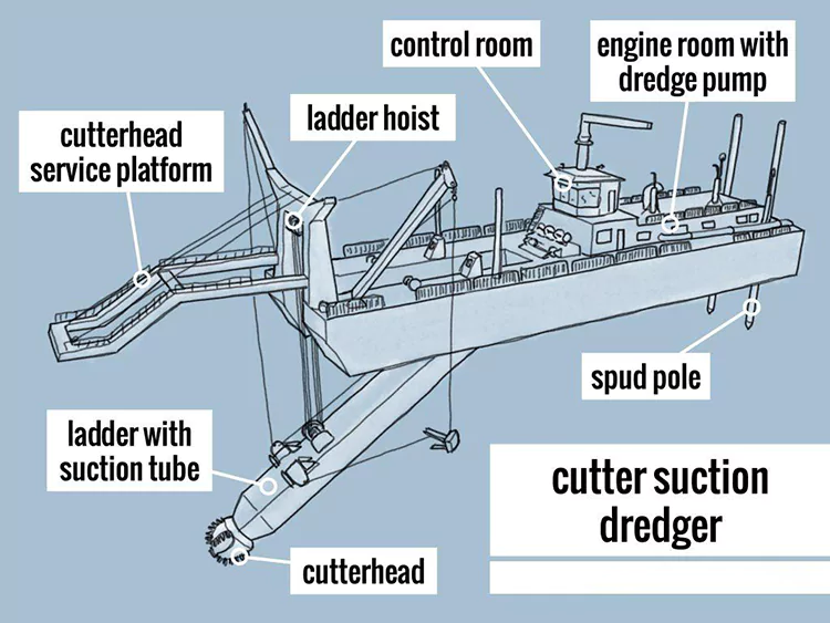 De kearnstruktueren dêrfan omfetsje in cuttersysteem, in suction- en ûntladingssysteem, in posisjonearring- en trochkringsysteem, en in krêftsysteem, wêrtroch yntegreare "ôfgraving-ferfier-ûnladen" operaasjes mooglik binne. It wurdt in protte brûkt yn rivierbaggerjen en werwinningsprojekten..
